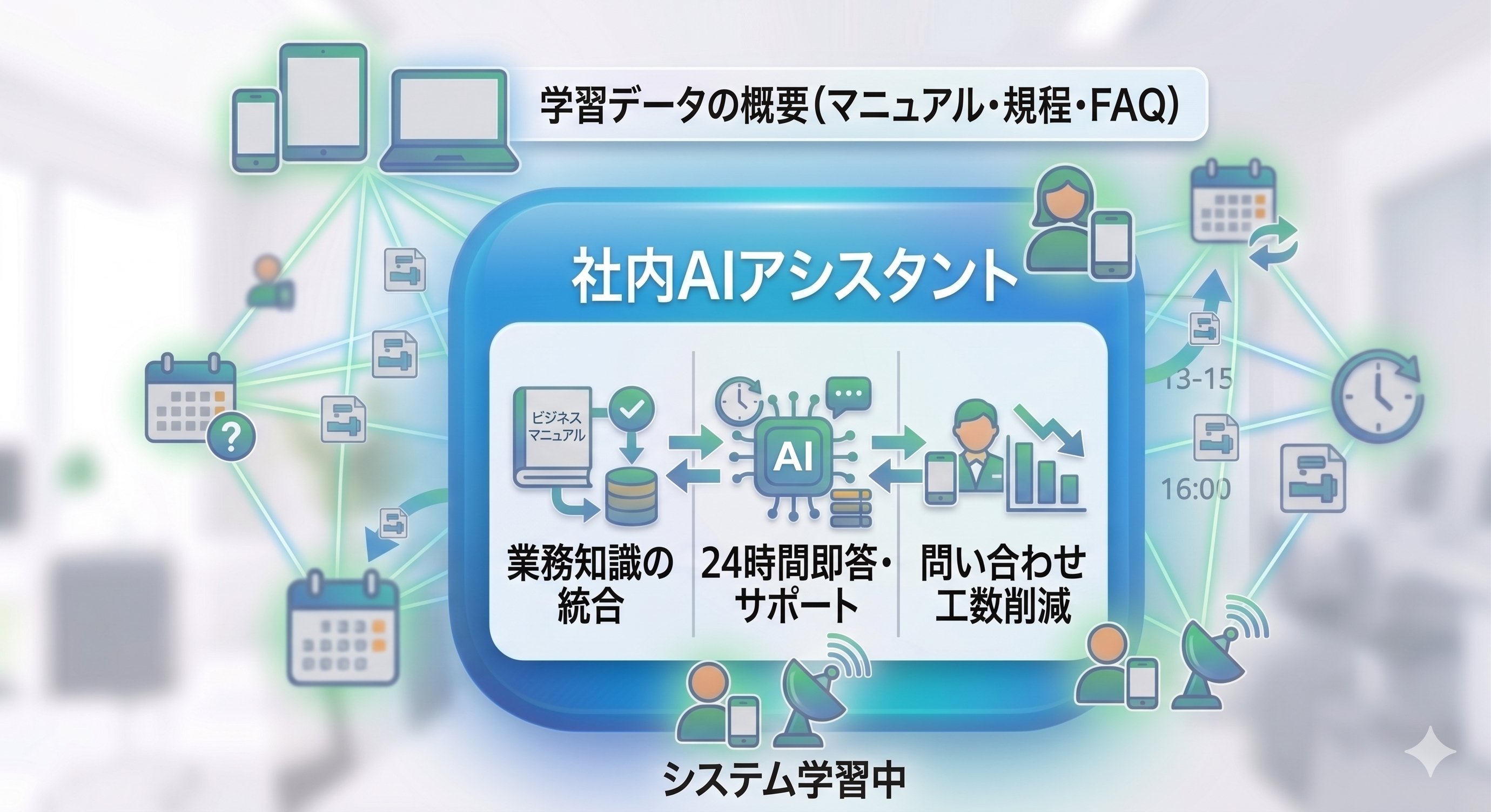 業務マニュアル・社内規程・FAQをAIが学習。スタッフの「これどうやるの?」に24時間即答。問い合わせ工数を大幅削減。