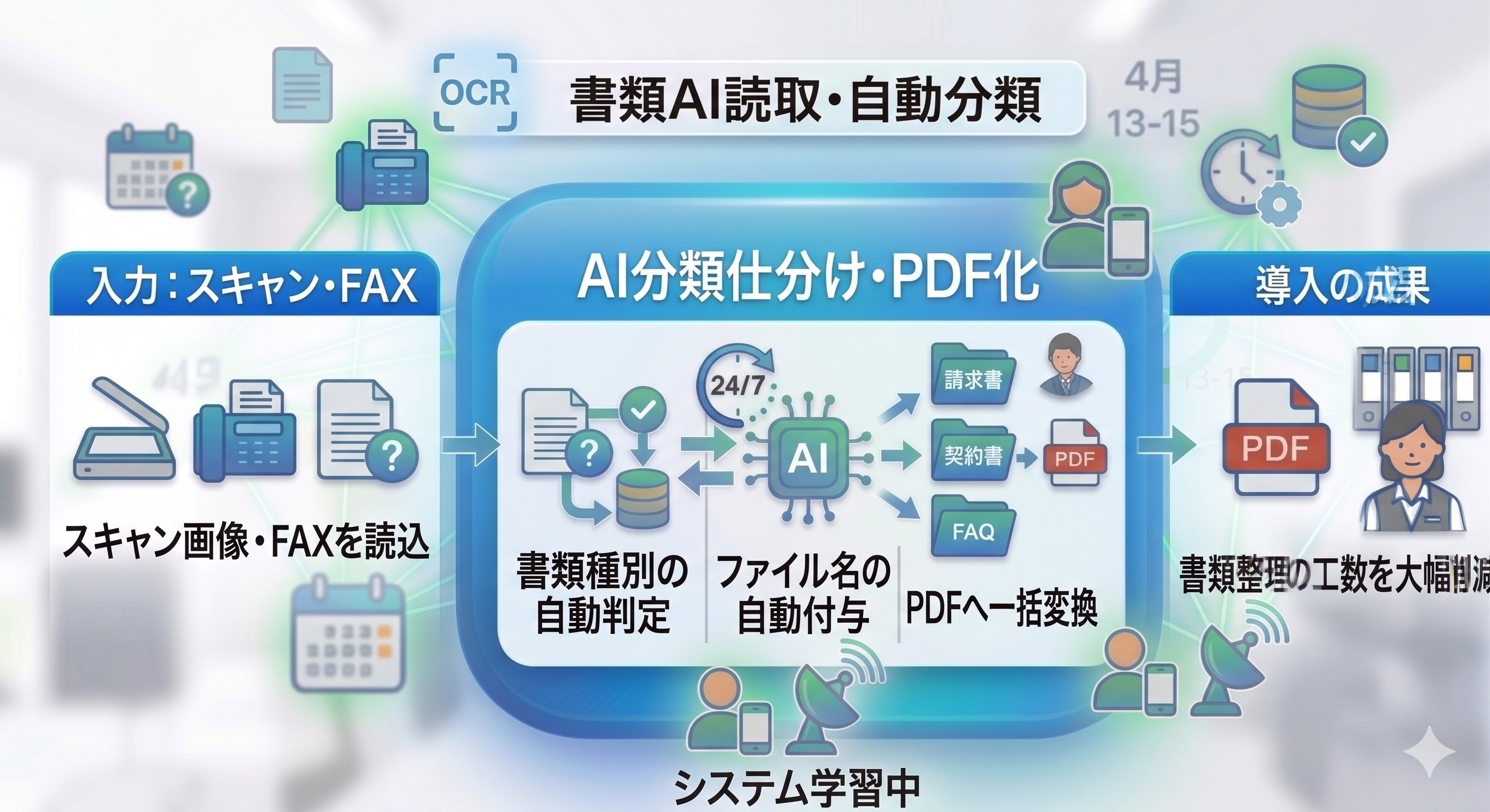 スキャン画像やFAXをAIが読み取り、書類種別の判定・ファイル名の自動付与・PDF変換まで一括処理。